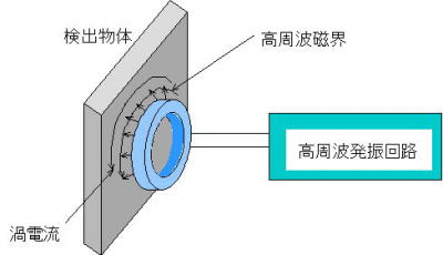| センサコイルに高周波電流を流して、高周波磁界を発生させます。この磁界内に金属板がありますと、電磁誘導作用によって金属表面に渦電流が発生して、センサコイルの発振振幅が小さくなります。この振幅を整流して直流電圧の変化とし取り出すセンサです。 取り出した信号と距離の関係をリニアライズ回路で直線性の補正を行いますと、リニアな出力が得られます。 このセンサの特長としては、 @センサ自体に可動部がないこと。 A静止状態から10KHz程度の高周波まで対応できること。 B距離なら距離の変化をμ単位で計測できること。 |