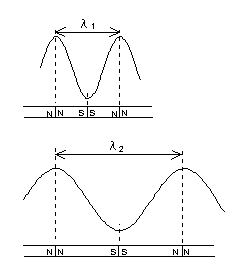 記録波長λは、配向された同極を突き合わせた微小磁石2個分の長さで、信号周波数|と相対速度の関係で表されます。