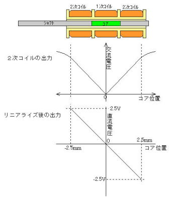| 1次コイルの前後に2次コイルを配した3つのコイル部とコアと呼ばれる金属を固定した軸棒(シャフト)で構成された差動トランス式センサです。 この1次コイルを交流励磁すると、2次コイルには、コアを介した誘導電圧が発生し、この出力を差動接続して、電圧差を変位出力としています。 シャフトのコア部分がコイルの中央に位置しているときは、2次側コイルの出力差は、ゼロとなり、前後に動かした距離に応じた出力差が得られます。 これを独自のリニアライズ回路で直線性の補正を行いますと、リニアな出力が得られます。 このセンサの特長としては、 @コアがコイルと接触していないこと。 A差動接続することで、温度にも安定な出力が得られること。 B独自のリニアライズ回路の採用により、 10mV=10μmのダイレクトな表示ができること。 |
